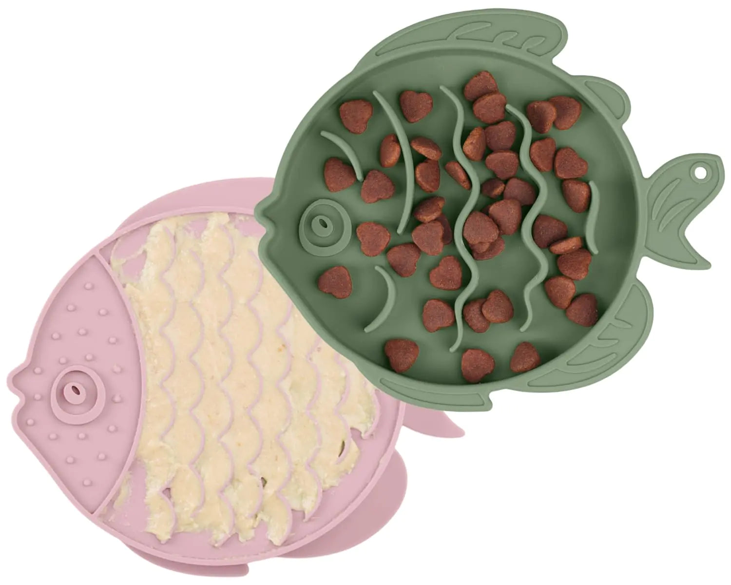 ["𝐒𝐩𝐞𝐜𝐢𝐚𝐥 𝐃𝐞𝐬𝐢𝐠𝐧 𝐟𝐨𝐫 𝐂𝐚𝐭𝐬 𝐄𝐚𝐭𝐢𝐧𝐠 𝐭𝐨𝐨 𝐅𝐚𝐬𝐭 - This cat bowl features raised fish patterns and grooves that are perfectly sized to ensure your cat can access their food while effectively slowing down their eating speed. This prolongs mealtime prevents choking and protects your cats esophagus and digestive system. \ufeff" "𝐒𝐥𝐨𝐰 𝐅𝐞𝐞𝐝𝐞𝐫 & 𝐋𝐢𝐜𝐤 𝐌𝐚𝐭 𝟐-𝐢𝐧-𝟏 - The bottom of the bowl has raised fish scale patterns designed to be gentle on your cats whiskers doubling as a raised lick pad for wet food and treats. The cute fish shape may spark your cats interest in food providing the mental stimulation your picky eater craves. It also helps reduce anxiety boredom and destructive behavior. Additionally the fish scale patterns on the bottom provide an anti-slip function." "𝐅𝐨𝐨𝐝-𝐆𝐫𝐚𝐝𝐞 𝐒𝐚𝐟𝐞 𝐒𝐢𝐥𝐢𝐜𝐨𝐧𝐞 & 𝐒𝐨𝐟𝐭 𝐟𝐨𝐫 𝐓𝐞𝐞𝐭𝐡 𝐏𝐫𝐨𝐭𝐞𝐜𝐭 - Made from food-grade safe silicone this bowl is free from BPA PVC phthalates and lead. There are no strong odors making it safe for your cats health. The soft texture is not only non-slip but also ensures your cats teeth remain undamaged." "𝐄𝐚𝐬𝐲 𝐭𝐨 𝐂𝐥𝐞𝐚𝐧 & 𝐄𝐧𝐝𝐮𝐫𝐢𝐧𝐠 𝐇𝐢𝐠𝐡-𝐥𝐨𝐰 𝐓𝐞𝐦𝐩𝐞𝐫𝐚𝐭𝐮𝐫𝐞 - Either by wiping or placing it in the dishwasher. Its heat-resistant high-temperature resistant non-slip and waterproof suitable for use in environments ranging from -76°F to 482°F. It can be used directly in the microwave refrigerator dishwasher and oven. Durable and long-lasting it wont be easily torn or chewed by your cat and is less prone to breaking compared to ceramic or plastic bowls." 𝐏𝐞𝐫𝐟𝐞𝐜𝐭 𝐂𝐚𝐩𝐚𝐜𝐢𝐭𝐲 & 𝐇𝐨𝐥𝐝 𝐚 𝐯𝐚𝐫𝐢𝐞𝐭𝐲 𝐨𝐟 𝐟𝐨𝐨𝐝𝐬 - Suitable for most cat breeds and sizes. It can hold dry kibble wet food solid liquid and various cat treats like yogurt peanut butter fruit puree spreads and organic health foods. For specific dietary recommendations please consult your veterinarian or cat food manufacturer to determine the ideal food quantity for your pet. (2 Pieces in Package Green&Pink)]